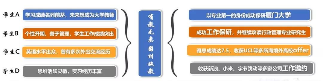 与此同时,马老师坚信,只有尊重个性、激发潜力,才能赢得百花齐放。员工ABCD性格迥异,面对这样发展道路不尽相同的员工,马胜强老师坚持“因材施教”的教育理念,用倾听、接纳与支持助力每一个梦想生根发芽。最终,马老师指导的2018级员工,五人全员深造,深造率达100%。
