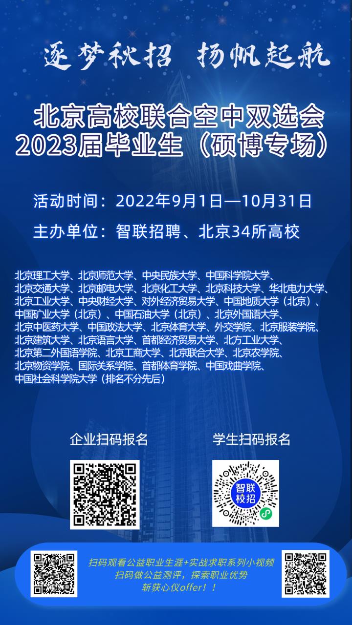 为全面贯彻落实教育部、北京市关于疫情防控工作的有关要求,更好地为用人单位和高校提供安全、便捷、高效地信息沟通和双向选择平台,抓住当前毕业生求职的关键期、冲刺期,全力促进高校毕业生顺利毕业、尽早就业。智联招聘联合北京32所高校于2022年9月1日至10月30日举办“逐梦秋招 扬帆起航北京高校联合空中双选会2023届毕业生(硕博专场)”活动。 活动期间大量覆盖客户,积极与员工进行互动,促进并解决用人单位和员工的双向需求。
