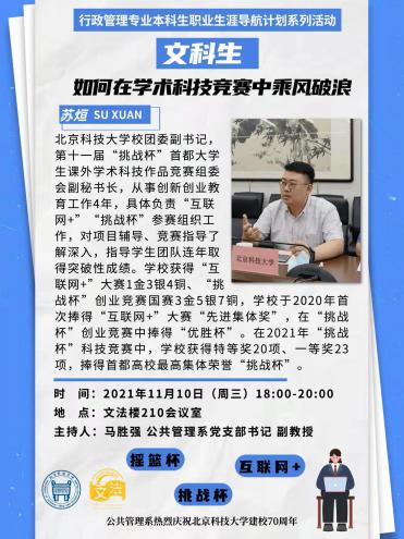 2021年11月10日晚6:00,以“文科生如何在学术科技竞赛中乘风破浪”为主题的“行政管理专业本科生职业导航计划”系列活动第一期讲座在文法楼210顺利举办。行政管理专业本科生职业导航计划旨在与学校同向同行,为公共管理系本科生提供更为系统性、深入性、个性化的人生启迪过程和职业生涯辅导。培养具有实践能力 、创新能力、领导能力的公共管理优秀人才。