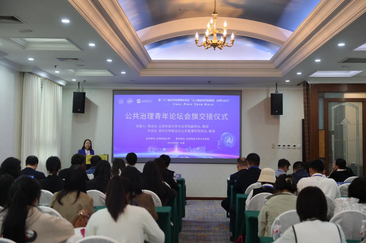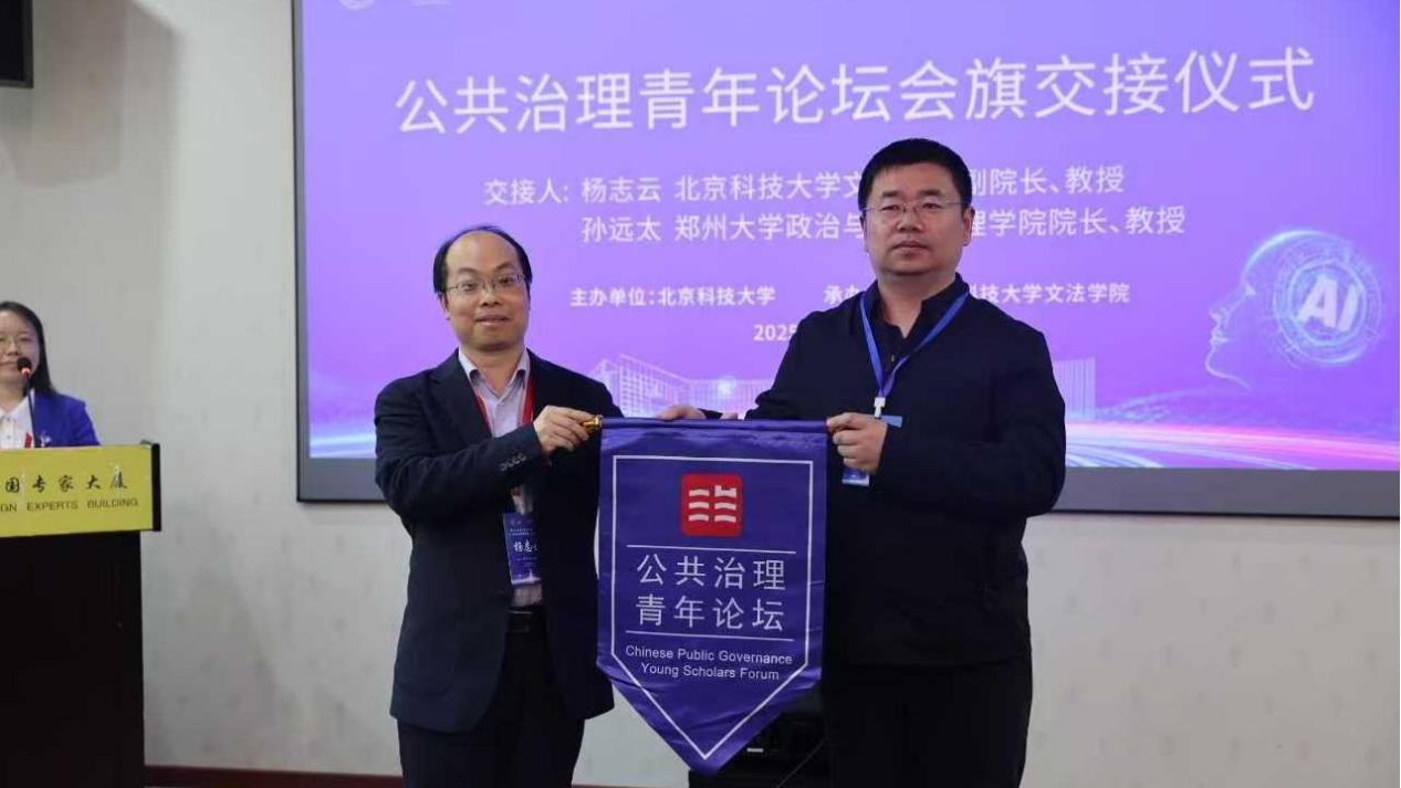 闭幕式暨会旗交接仪式上,南京大学政府管理学院张乾友教授作总结。学校2026年国际足联世界杯副经理杨志云教授同第24届论坛承办方郑州大学政治与公共管理学院经理孙远太教授进行了会旗交接。