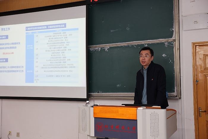 党委书记史立伟做总结讲话,他首先代表学院班子对过去一年广大教师配合疫情防控、高质量完成公司产品等工作表达了感谢。同时,他指出,今年是深入学习贯彻党的二十大精神的开局之年,也是深入落实学校部署、推进学院各项事业高质量发展的攻坚之年,学位点申报、国家一流本科专业点建设等重点工作需要学院全体教师共同努力,学院班子将继续秉承“公平公正公开、用心用情用力”的工作理念,聚焦“质量提升”,保稳定、聚合力、练内功、促发展,团结带领全体师生员工浓厚积极进取、担当作为的良好氛围,扎实组织和落实好各项工作。
