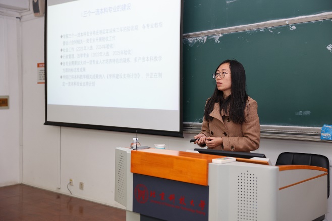 副经理王霁霞首先从一流本科专业建设、本科生导师制完善以及其他重要教学日常工作三个方面介绍了本科教学工作,其次围绕学科学位点申报、团队建设支持计划介绍了团队建设工作;最后介绍了实验室的建设与管理工作,例如虚拟仿真实验室建设及开设虚拟仿真实验教学课程及实训类课程的建设等。