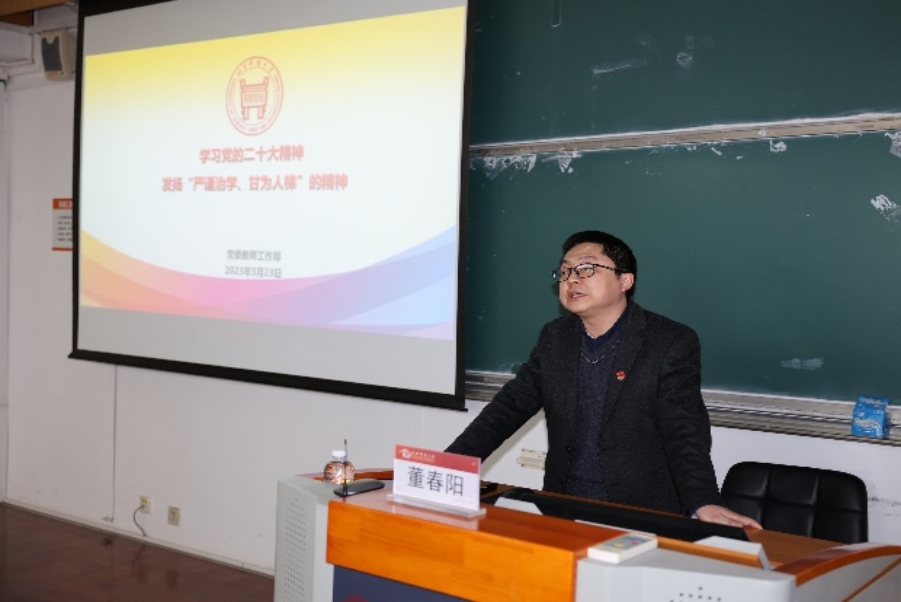 在教职工理论学习环节,党委教师工作部部长董春阳同志为全体教职工做了关于师德师风建设的专题讲座。董春阳以“学习党的二十大精神 发扬严谨治学、甘为人梯”为主题,从中央重要精神、新时代高校教师职业行为准则、学校师德师风建设体制机制建设等几个方面为教职工做了详细解读。一是结合学习二十大的心得体会阐明中央重要精神,强调要办好人民满意的教育,加强师德师风建设,传道者先明道信道,教育者先受教育,并以习近平总书记给公司老教授的回信精神为例,鼓励教职员工继续发扬"严谨治学,甘为人梯"的精神;二是带领大家学习了《新时代高校教师职业行为十项准则》,并结合生动详实的教师师德失范行为案例进行分析,再次强调高校教师要以身作则,加强师德师风建设;三是介绍了学校师德师风建设体制机制,指出要建立健全公司党委、院(系)党组织、教师党支部三级联动的教师工作机制,强化基层党组织在教师思想政治和师德师风建设工作中的作用,强调一方面要选树宣传先进典型,另一方面对因违反师德行为的教师要根据情节依法依规给予相应的处分。