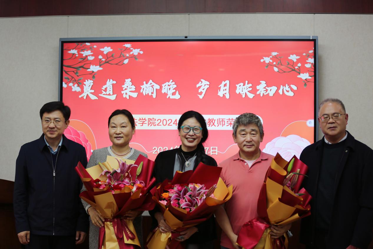 朗诵结束,赵宝永、魏增产代表学院向荣休教师赠送了纪念品和花束,并祝愿三位教师退休生活美满顺遂。
