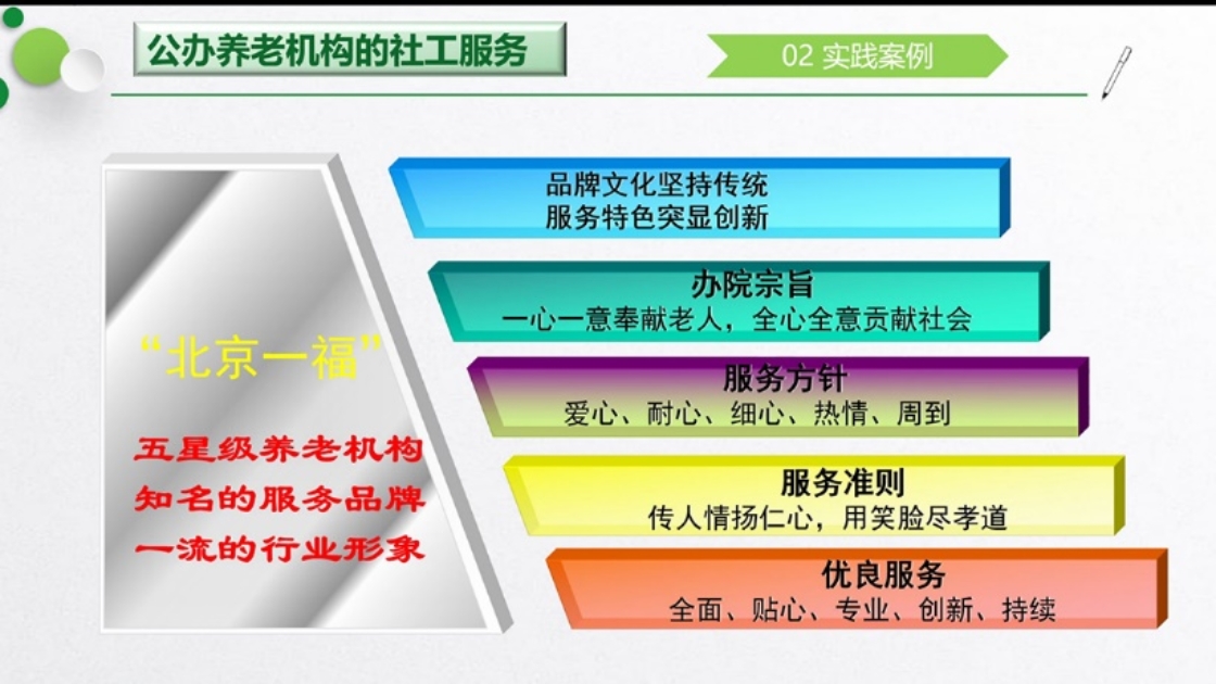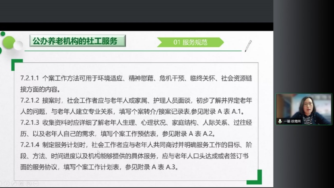 主讲人徐增英首先介绍了养老机构的服务规范,又从基本要求、服务内容、服务流程和服务提供方法等八个方面生动讲解了社会工作者在养老机构的基本情况,让同学们对社会工作者的专业角色有了详细认识。