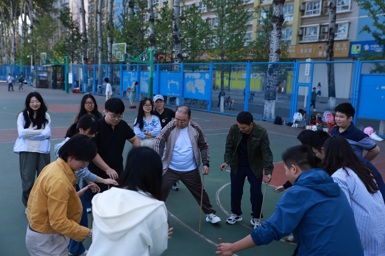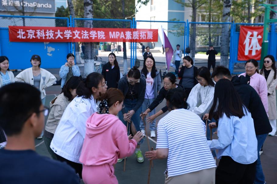 “同心同行,共创辉煌!”“文法八组,势如猛虎!”各小组响亮的口号此起彼伏,彰显着MPA学子的精神风貌。在体育学院专业教练的指导下,“不倒翁”项目率先展开。同学们围成同心圆,手持木棍凝神以待。“三、二、一,移!”令声刚落,身影闪动,同学们敏捷地移动步伐,稳稳接住旁边同伴的木棍。这一刻,专注的眼神、默契的配合、会心的微笑,构成了一幅动人的画面。