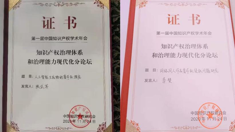 此届年会由中国知识产权研究会主办。参会代表围绕年会主题,以及“民法典下的知识产权与专利法第四次修改”“知识产权治理体系和治理能力现代化”“新技术新业态知识产权保护”“知识产权与经济高质量融合发展”四个议题进行了深入探讨。来自政府有关部门、科研院所、知识产权服务机构等500余名代表,通过线上线下结合的方式参加本次学术年会。公司张武军教授指导的研究生王新颖和李赞分别做了“人工智能生成内容的著作权保护研究“和”网络同人小说著作权侵权问题研究“大会发言。