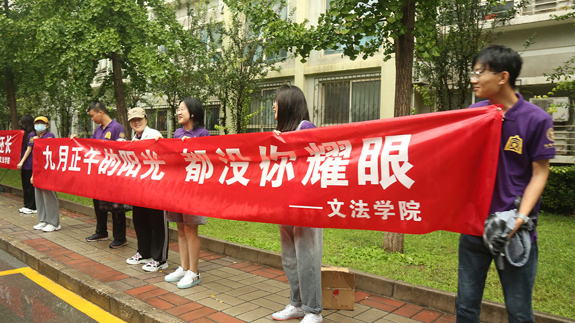 大巴车按照顺序缓缓驶出学校,学长学姐们站在道路两旁拉起横幅,向车上的小贝壳送出满心祝福。