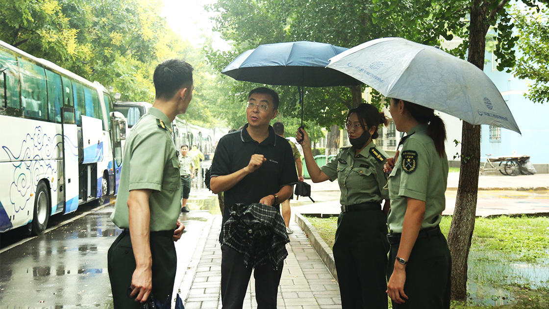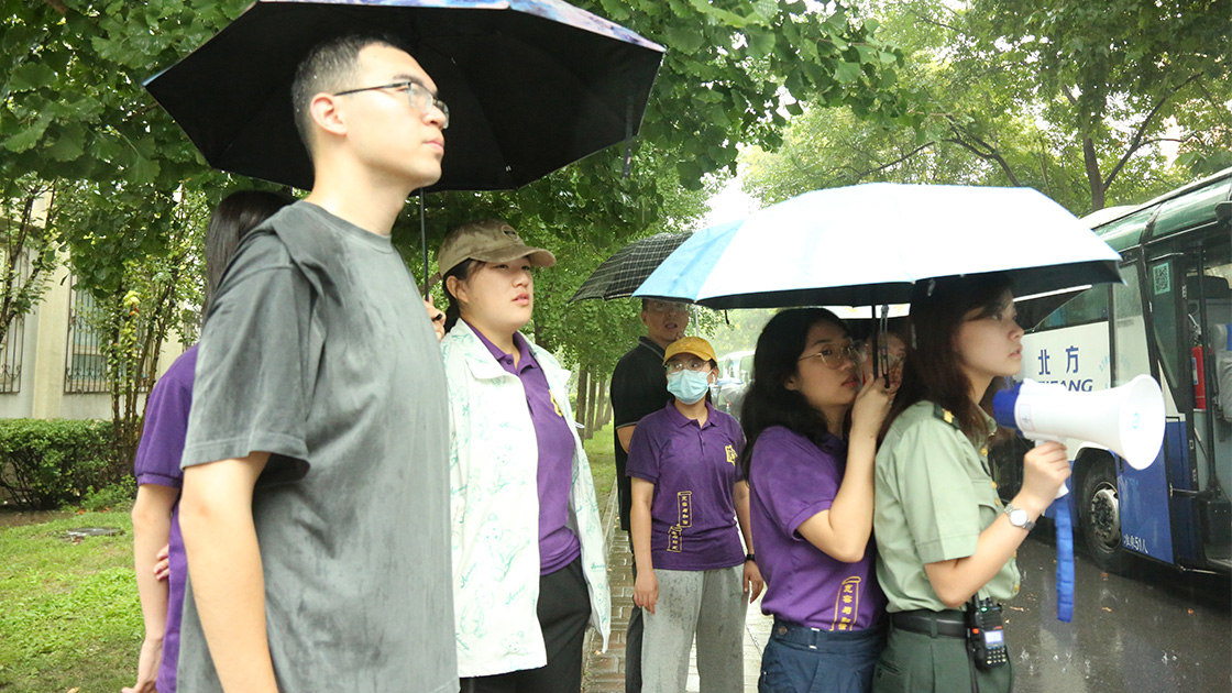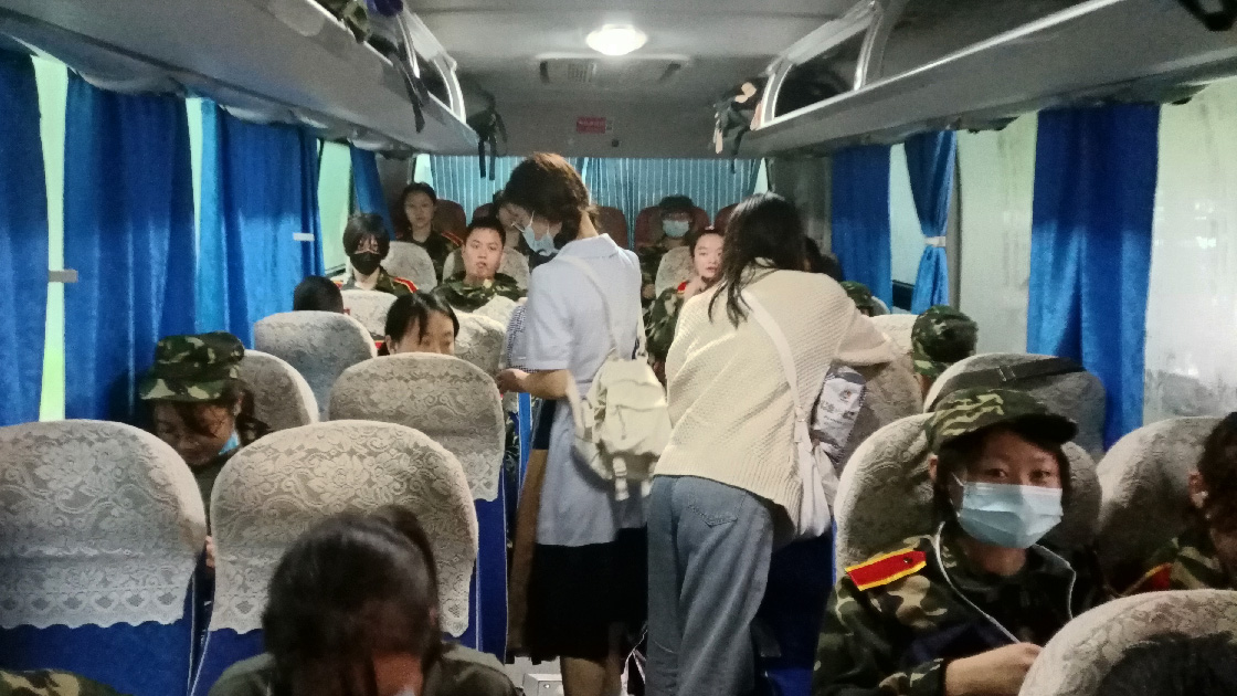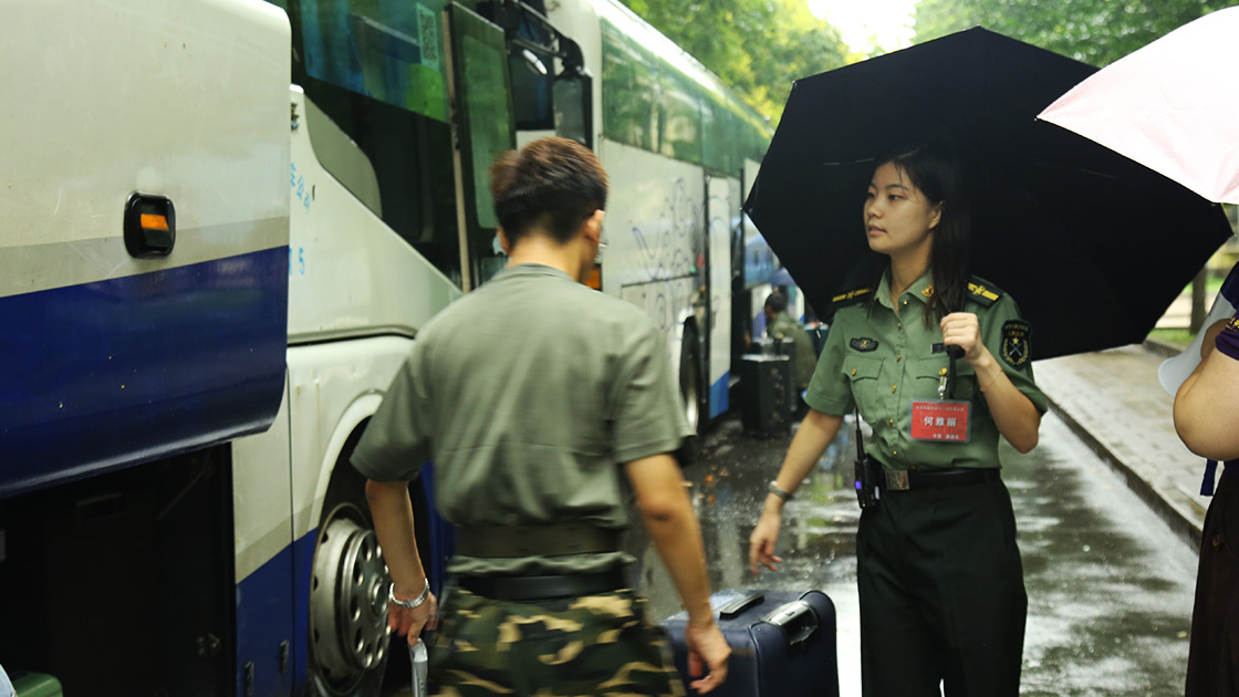 尽管清晨大雨磅礴,2021级文法学子们依旧戴上军帽,身着戎装,手拉行李,准时在指定地点进行集合。在志愿者的帮助下放置好行李,准确清点完人数后,同学们有序登上大巴车,准备前往怀柔军训基地。