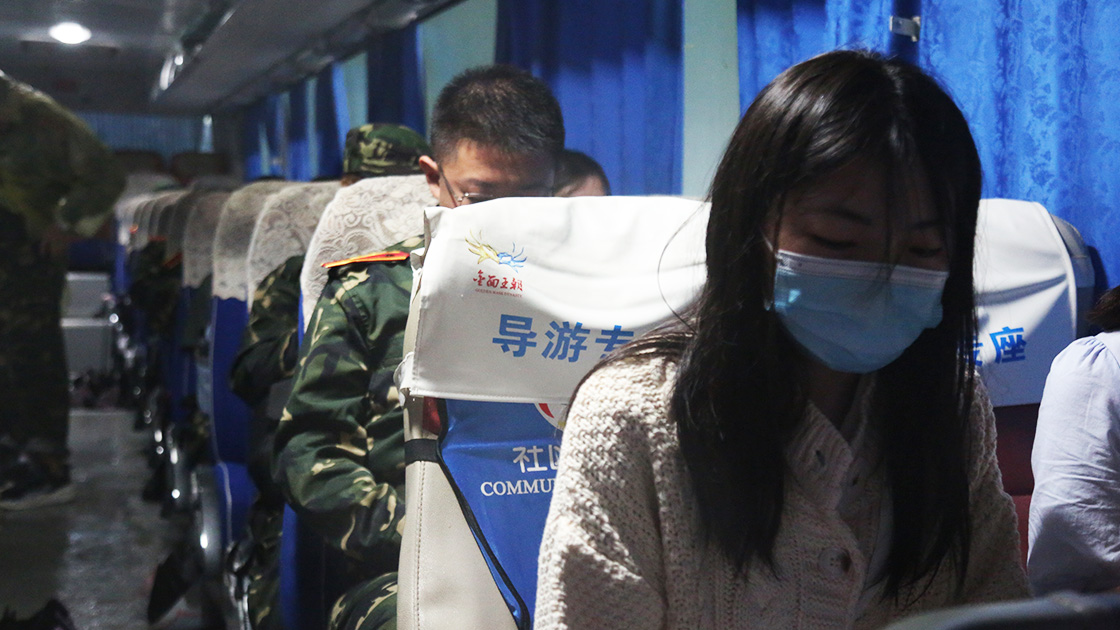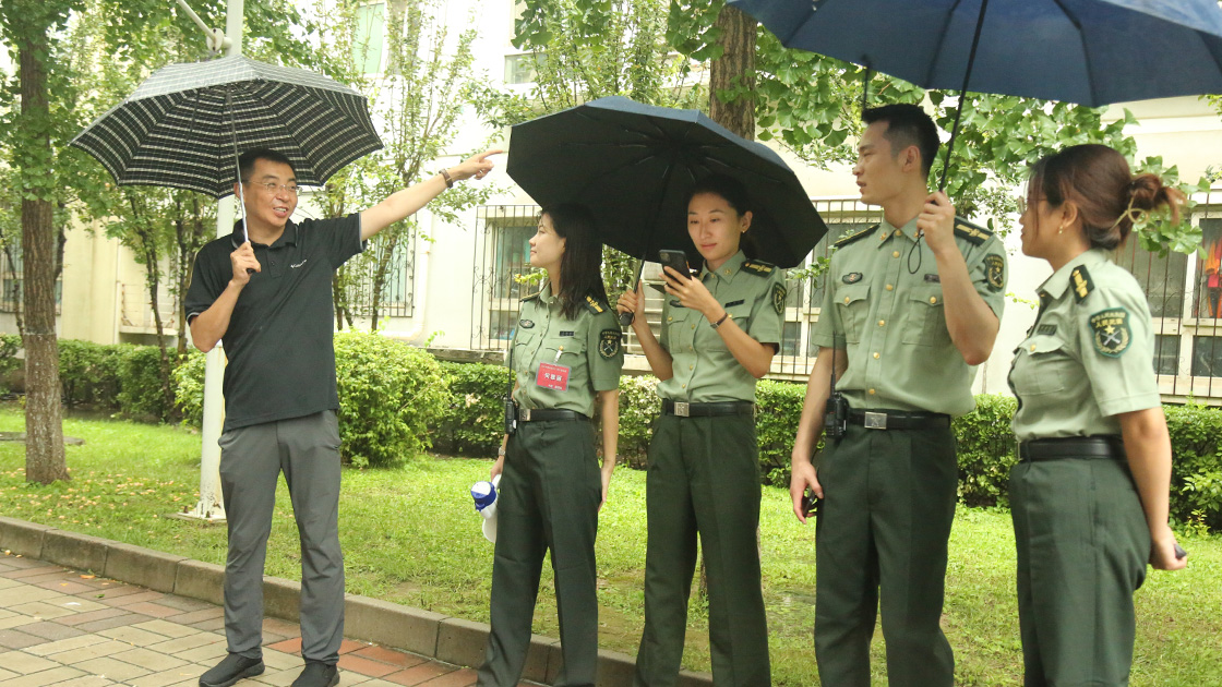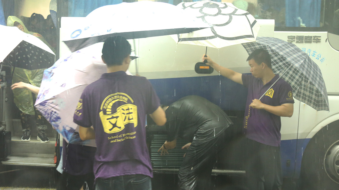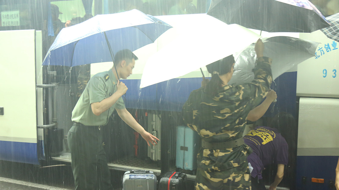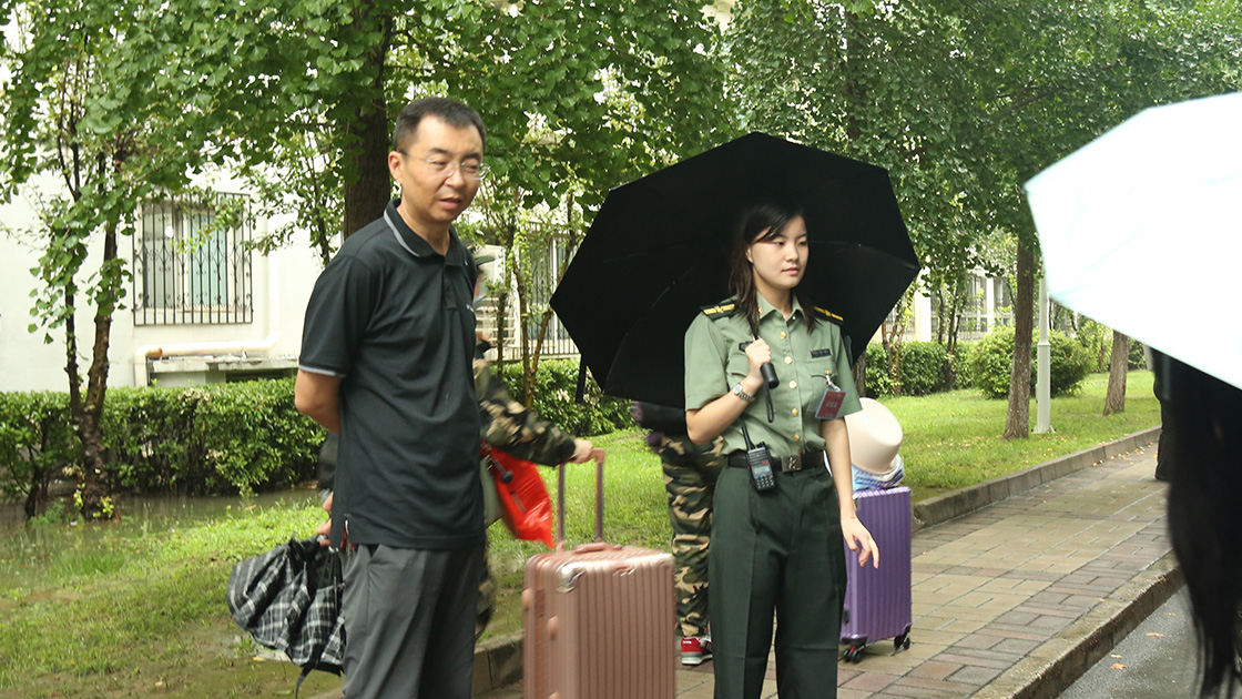 尽管清晨大雨磅礴,2021级文法学子们依旧戴上军帽,身着戎装,手拉行李,准时在指定地点进行集合。在志愿者的帮助下放置好行李,准确清点完人数后,同学们有序登上大巴车,准备前往怀柔军训基地。